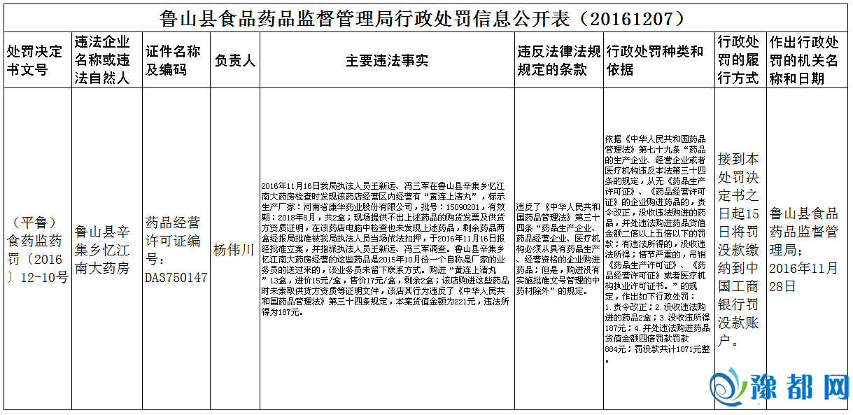 《鲁山县食品药品监督管理局行政处罚信息公开表(20161207)》由河南新闻网-豫都网提供,转载请注明出处:http://pds.yuduxx.com/lushan/518438.html,谢谢合作!