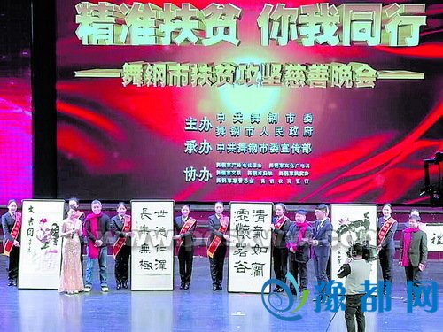 ????晚会上,舞钢市农商银行等企业共募集资金350万元用于精准扶贫,并向特困户代表每户资助现金1000元,向该市卫计委捐赠两台救护车。舞钢籍知名书画人士还举办了助力扶贫的书画作品义卖竞拍活动,共谋得善款31000元,上缴市财政扶贫账户,用于精准扶贫事业。