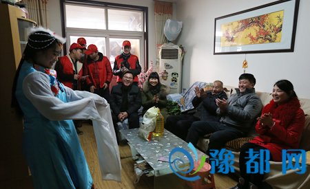 活动中,团区委组织河南城建学院艺术设计学院20余名大学生志愿者,到王马山、王书方、余光慈三位老人家里,在为他们送去大米、食用油等生活用品的同时,志愿者们还帮助老人打扫卫生、与老人一起促膝长谈,并为老人们送去了精心准备的藏族舞蹈、我的中国心、相亲相爱的一家人等歌舞表演。王书方老人拉着志愿者的手激动地说:谢谢党和政府给我们送来的温暖,这真是办在身边的小春晚啊!