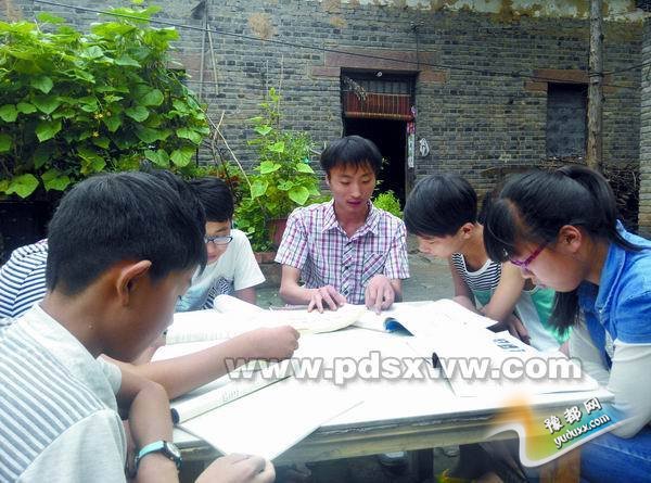李赛在自家院里辅导学生学习。