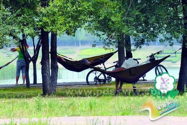 ????□记者 牛超????平顶山新闻网讯 酷暑难耐,市区建设路西段白鹭洲国家城市湿地公园的树林里又热闹起来,不少人躺在吊床上纳凉,不顾树枝在拉扯中“变形”。