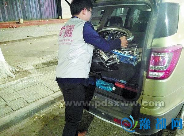 ??? 12月16日晚,小王的代驾公司老板(穿马甲者)向记者演示,如何将折叠自行车装入客户汽车后备厢内。