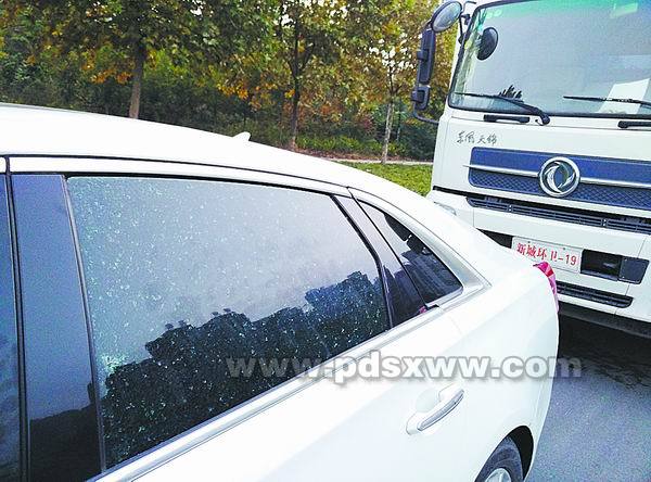 ????凯迪拉克轿车司机李先生说,当天下午1时40分,他驾车途经育英路建业桂园门口附近时,这辆洒水车迎面驶过,“嘭”的一声响后,他发现自己的爱车左后窗玻璃受损。记者看到,凯迪拉克轿车左后窗玻璃局部有一小孔,整块玻璃有裂纹(上图)。