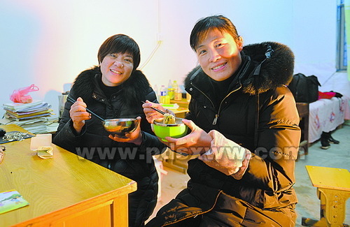 ??? 1月6日傍晚,在鲁山县辛集乡第六小学支教的新华区联盟路小学教师苏豪珍(右)和新华区实验小学教师毛素显(左)结束了忙碌一天的工作,在宿舍内吃汤面条。