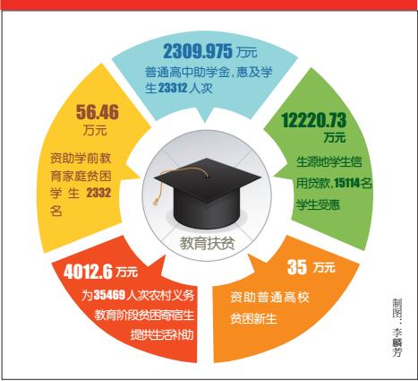 ????助学金2309.975万元,惠及学生23312人次;落实资金56.46万元,对2332名学前教育家庭贫困学生进行资助;落实资金4012.6万元,为农村义务教育阶段贫困寄宿生提供生活补助35469人次;落实资金35万元,为贫困大学新生入学提供资助;发放生源地学生信用贷款12220.73万元,惠及学生15114人。