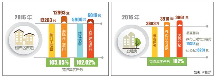 ????2016年,河南省政府下达我市棚户区改造新开工任务12263套(户),续建项目基本建成5900套。截至2016年底,我市已开工项目24个12993套,完成年度任务的105.95%;基本建成项目10个6019套,完成年度任务的102.02%;完成公共租赁住房分配3961套,完成年度任务的102%。